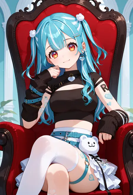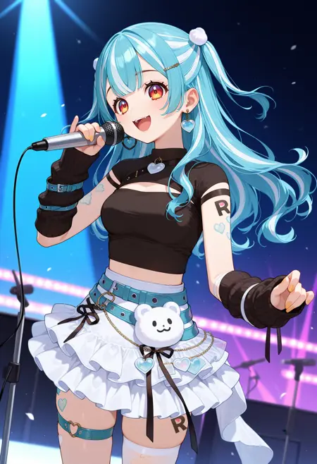 outfit3ccramune, long hair, streaked hair, blue hair, two side up, hairclip, earrings, harness, clothing cutout, black shirt, arm tattoo, black arm warmers, midriff, blue belt, layered skirt, white skirt, single thighhigh, white thighhighs, leg tattoo, thigh strap