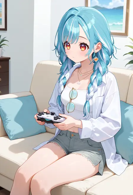 outfit4ddramune, short hair, blue hair, bob cut, earrings, necklace, eyewear hang, white camisole, collared shirt, white shirt, long sleeves, midriff, short shorts, grey shorts