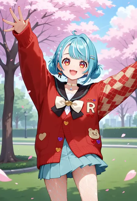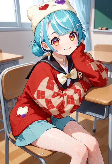 outfit2bbramune, streaked hair, blue hair, double bun, hat, white headwear, hairclip, earrings, white choker, white bowtie, black sailor collar, red cardigan, long sleeves, sleeves past wrists, pleated skirt, blue skirt, fishnet pantyhose