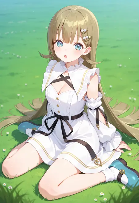 outfit1aalisa, long hair, brown hair, hair ornament, blue eyes, frills, clothing cutout, cleavage, white dress, sleeveless, detached sleeves, black ribbon, black belt
