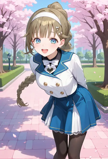 outfit5eelisa, long hair, brown hair, braided ponytail, high ponytail, white hairband, hair ornament, blue eyes, school uniform, white bowtie, white jacket, long sleeves, double-breasted, overskirt, blue skirt, black pantyhose
