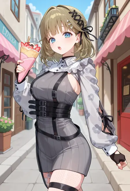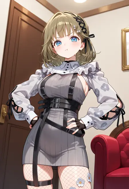 outfit4-1 (medium hair)ddlisa, medium hair, brown hair, hair ribbon, hair ornament, blue eyes, harness, floral print, shrug (clothing), grey shirt, grey dress, long sleeves, fingerless gloves, black gloves, belt, thigh strap, fishnet pantyhose