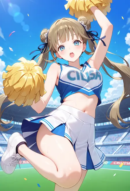 outfit3cclisa, long hair, brown hair, double bun, twintails, hair ribbon, blue eyes, chinese clothes, shoulder cutout, white shirt, short sleeves, pink sleeves, black gloves, lace gloves, midriff, white skirt, white thighhighs