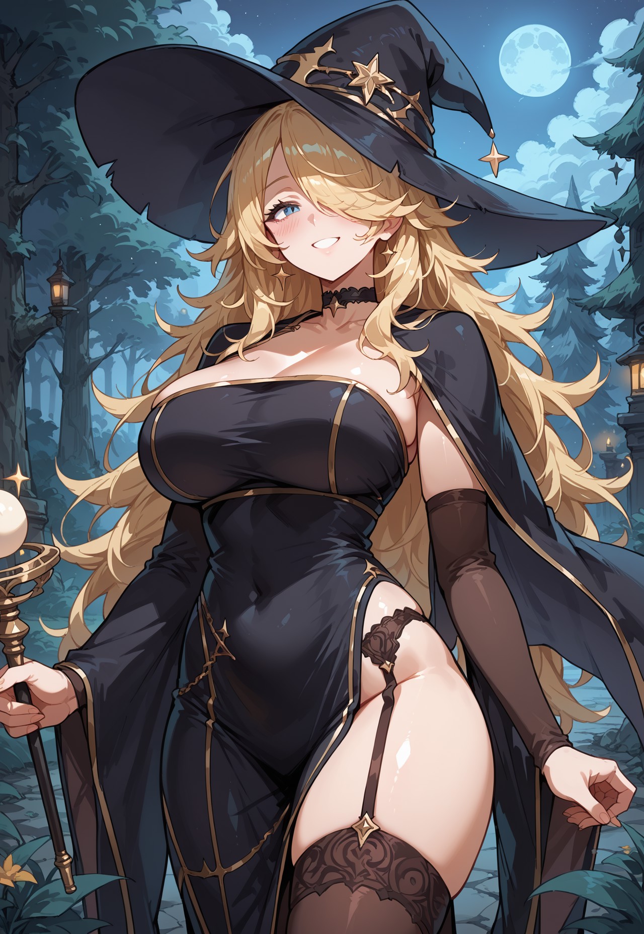 Orlea_CZN, ブロンドの髪, 非常に長い髪, 片目を覆う髪, 青い目, 乱れた髪, すすり落ちた前髪, 曲線的な体型, 三日月型のハロー, 頭上のハロー,