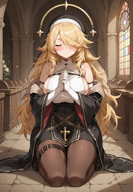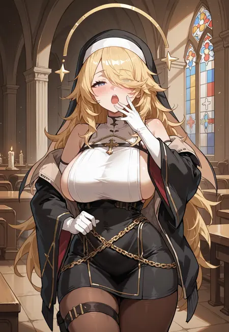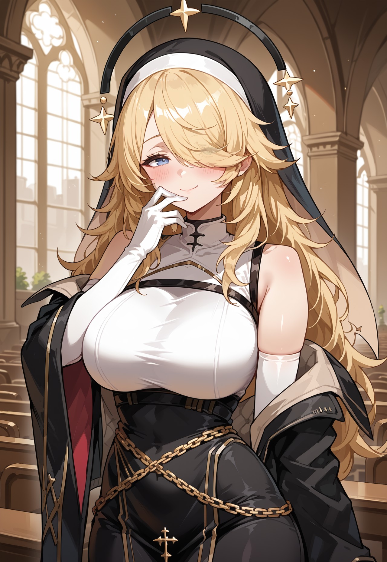 修道女, 修道女服, ドレス, 白いトップス, チュールネックトップス, 袖なしトップス, サイドボブ, 黒いスカート, 短めのスカート, ペンシルスカート, パンティーストッキング, 太ももストラップ, 白い手袋, 肘まである手袋, 黒いジャケット, オフショルダージャケット, チェーンベルト, 金色のチェーン,
