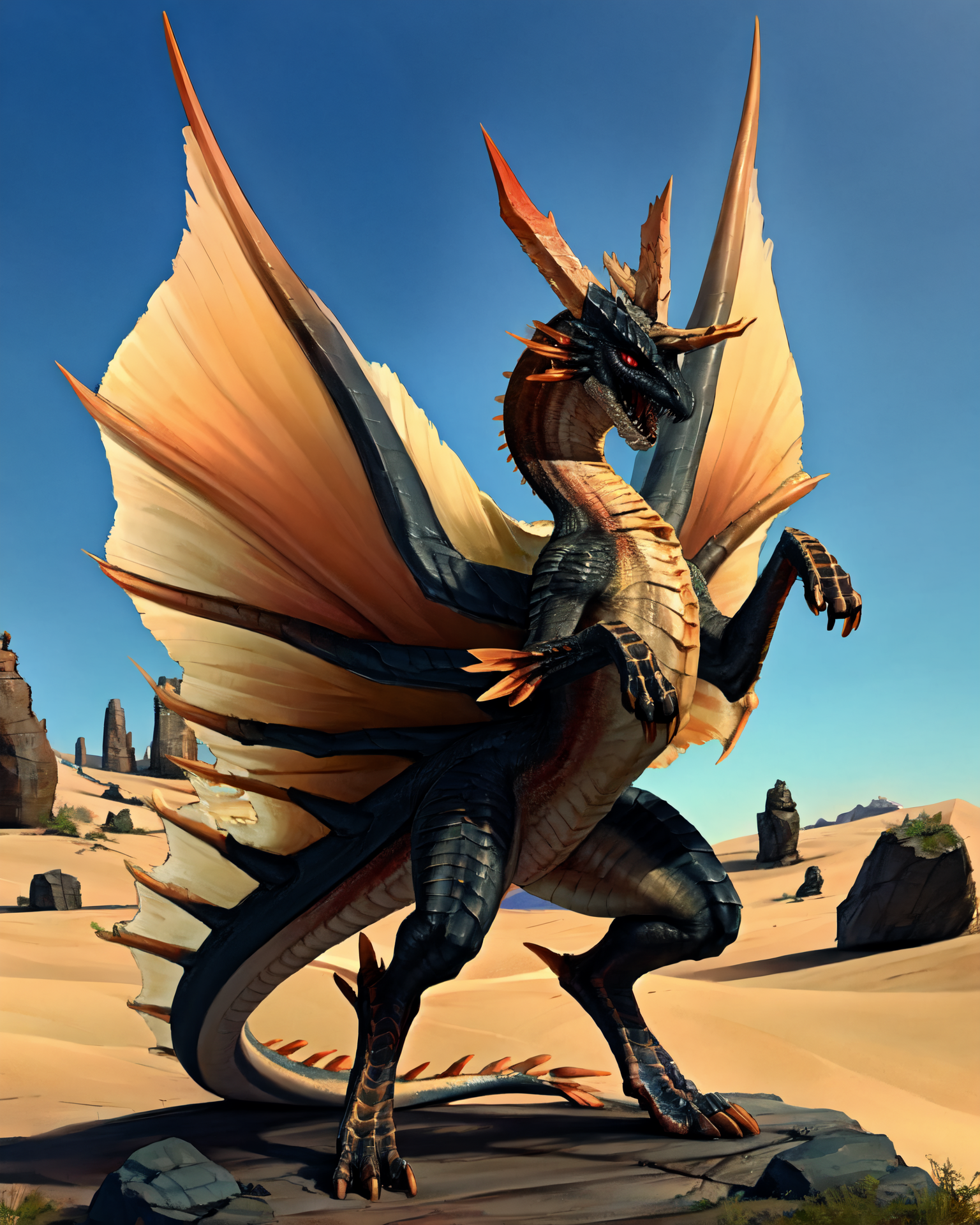 Ruko positives: rukodiora, red eyes, orange horns, nose horn, orange wings, tail, black scales