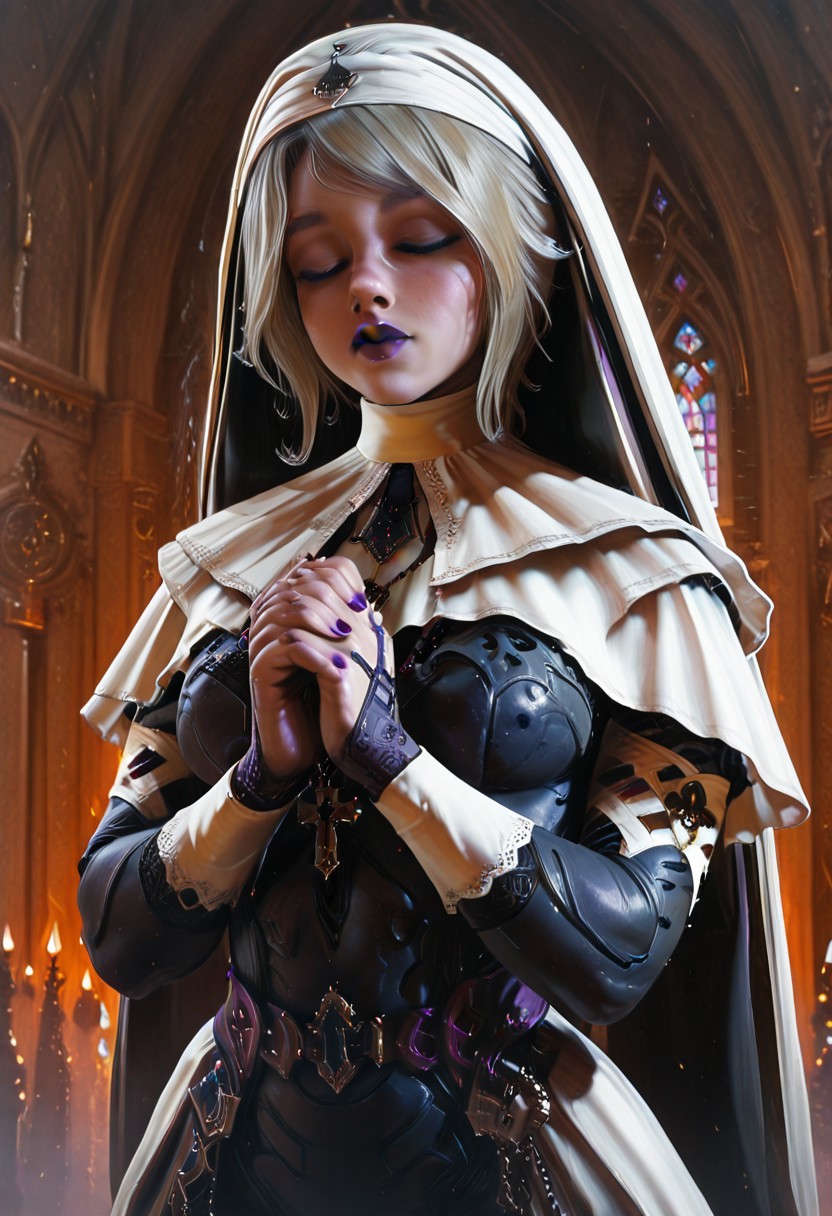Veil,bodysuit,nun collar, ornate gold cross necklace,key-themed accessories,futuristic nun's habit,boots,