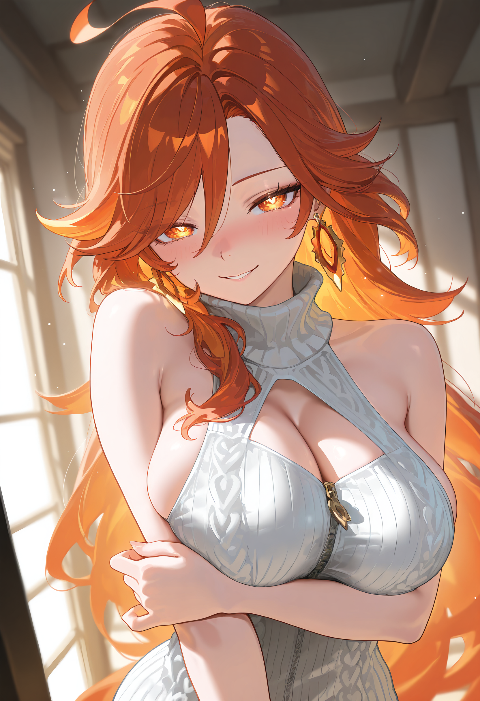 彼女の外見用タグ: 1girl, solo, 記号形の瞳, 赤い目, 大きな胸, 赤い髪, 長い髪, ahoge, オレンジ色の髪, 眉間, オレンジ色の目, 多色の髪, ピアス,