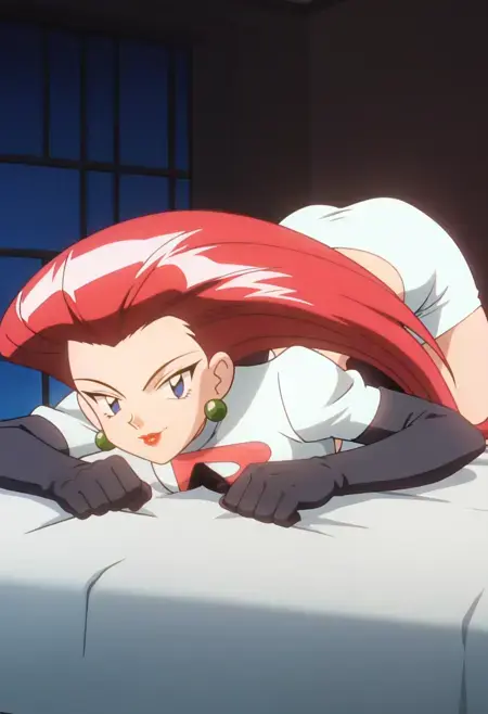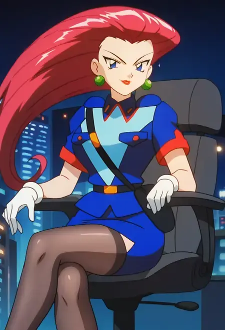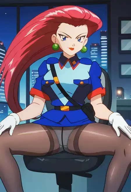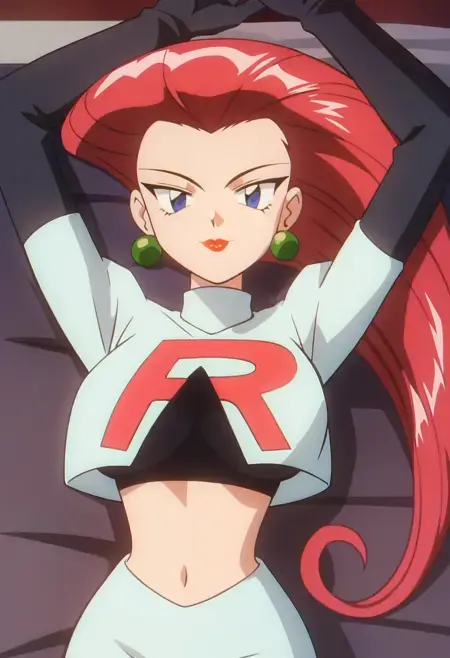 팀 로켓 유니폼, 짧은 재킷, 팔꿈치 장갑, 배꼽, 미니 스커트, 흰 스커트, 허벅지 스타킹,