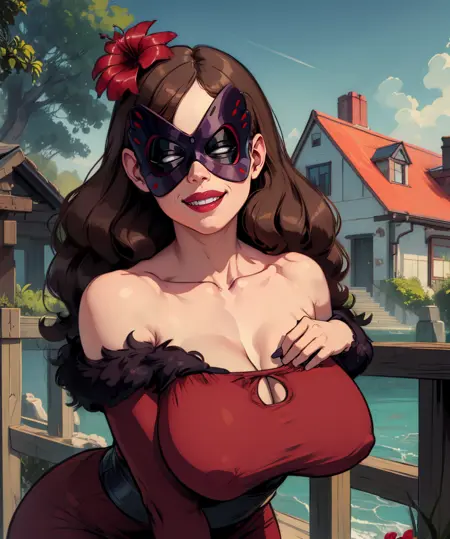 카멜리아, 도미노 마스크, 머리에 꽃, 갈색 머리 또는 회색 머리,