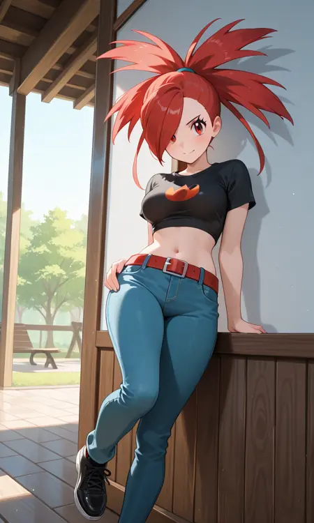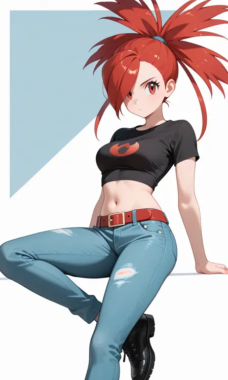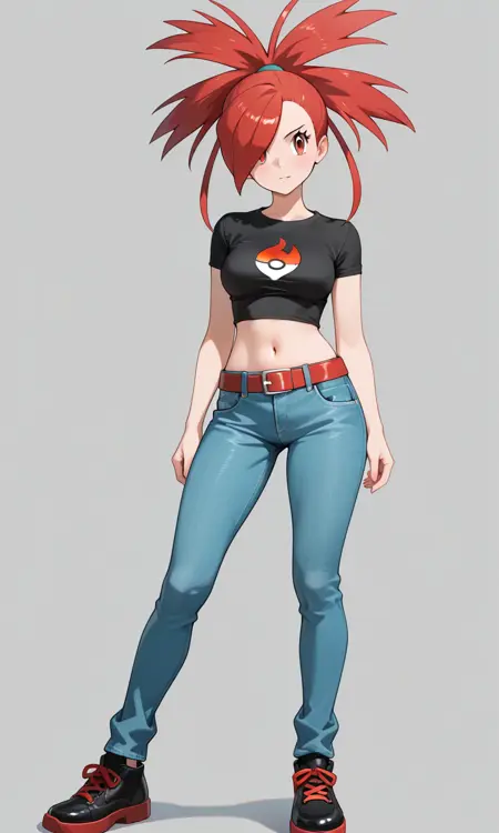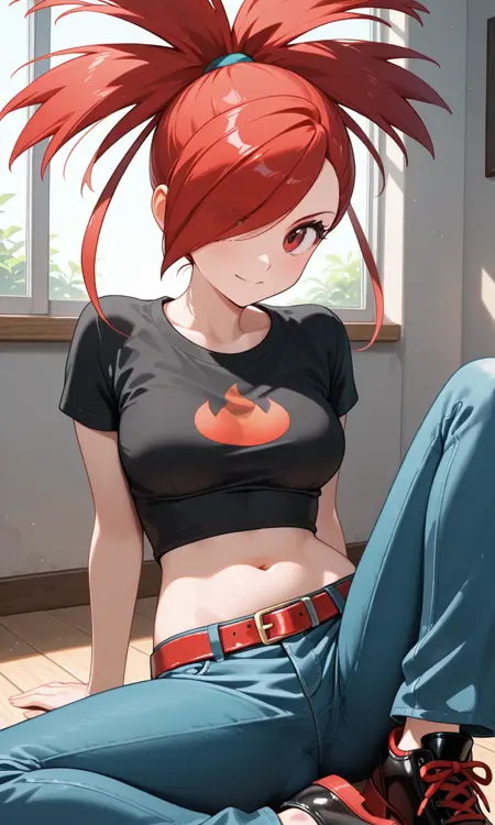 Flannery (Pokémon Series), long hair, red eyes, red hair, ponytail, spiked hair, hair over one eye, hair tie, eyelashes, medium breasts, thighs, shirt, navel, short sleeves, shoes, pants, belt, midriff, black footwear, crop top, black shirt, denim, t-shirt, buckle, jeans, belt buckle, blue pants, cropped shirt, red belt