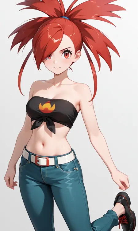 Flannery (Pokémon Series), long hair, red eyes, red hair, ponytail, spiked hair, hair over one eye, hair tie, eyelashes, medium breasts, thighs, shirt, navel, bare shoulders, collarbone, sleeveless, pants, belt, midriff, crop top, black shirt, strapless, sleeveless shirt, bare arms, swept bangs, denim, front-tie top, buckle, jeans, belt buckle, blue pants, bandeau, tube top, tied shirt, white belt, red bandeau