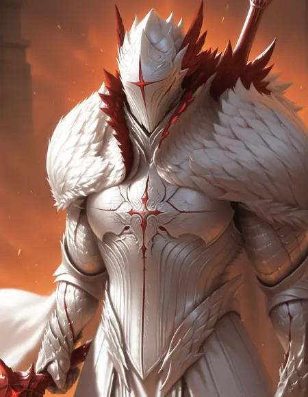 korpaladin, armor, red cross-shaped visor, shoulder armor, male focus, holding sword, helmet, fur trim, gauntlets