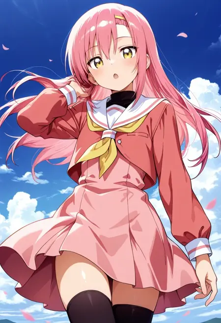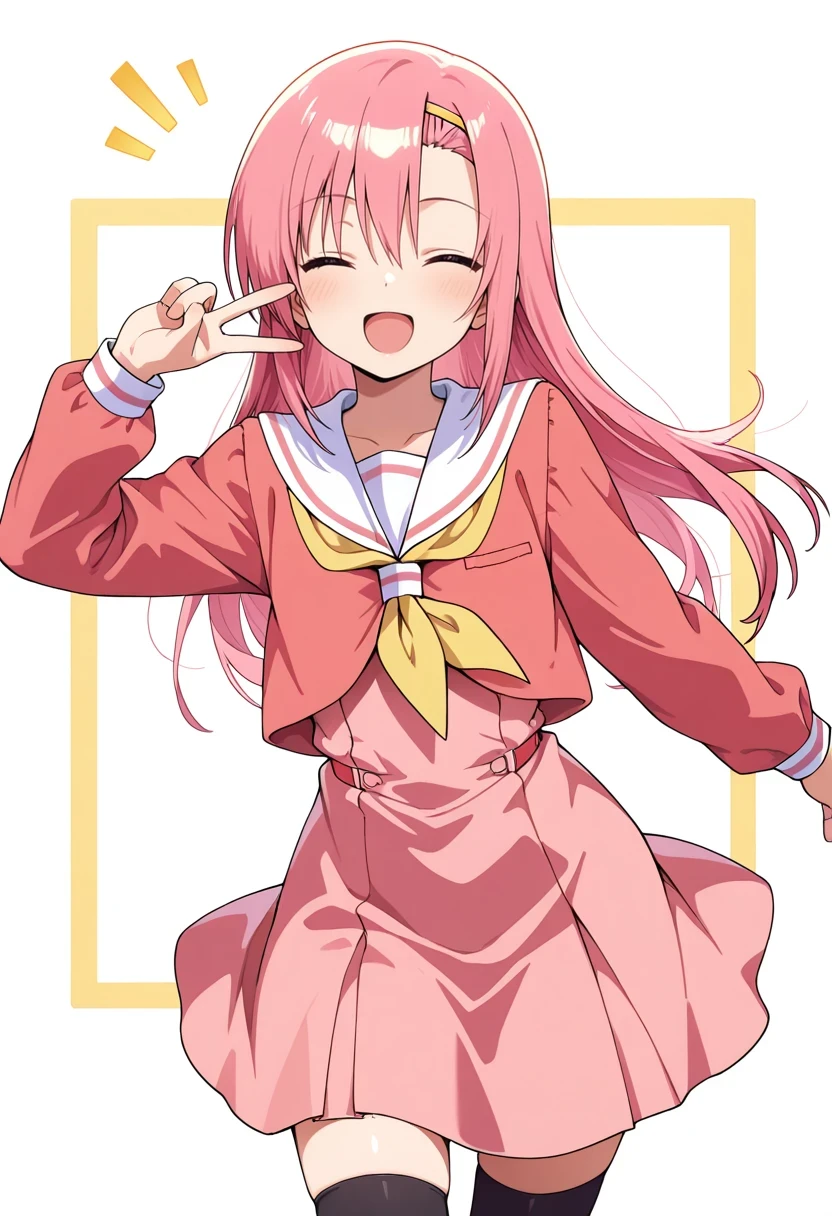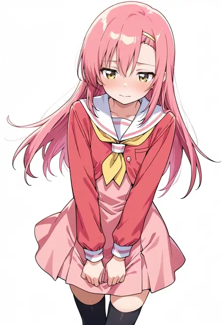 白いセーラー collar、ピンクのドレス、黄色のネッカチーフ、白皇学園の制服、黒の thighhighs,