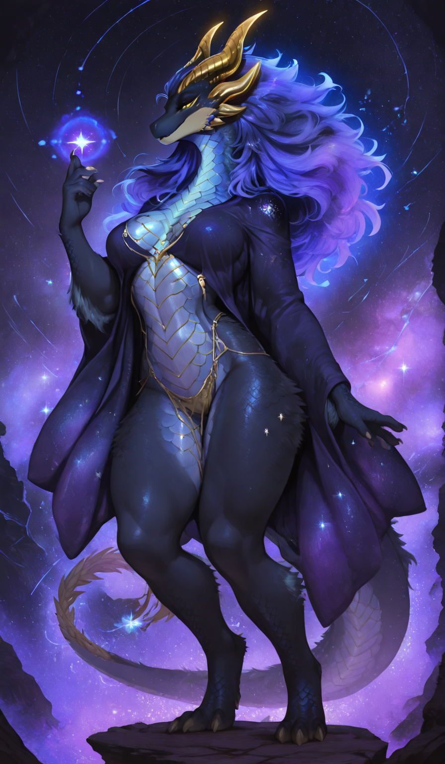 Aurelis, anthro dragon, furry female, digitigrade legs, long tail, blue celestial scales, glowing purple hair, golden horns, golden eyes, muscular yet feminine form, claws, snout, soft fur patches, star-glow highlights
