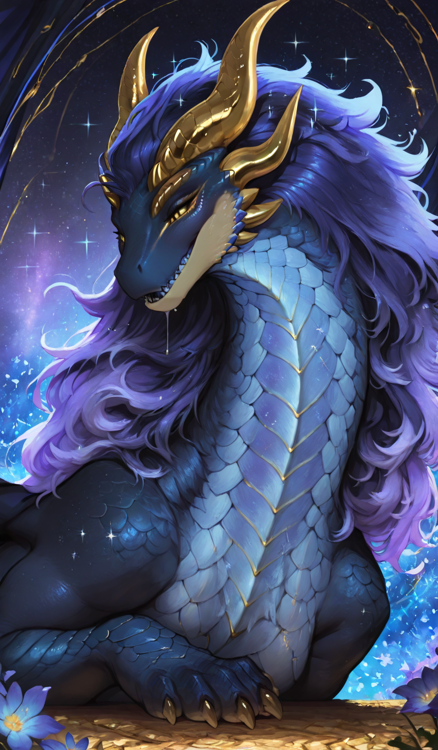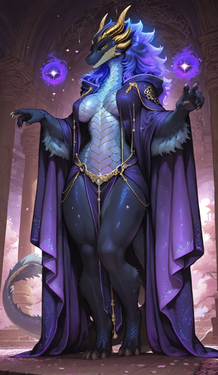 1girl, Aurelis, dragon, furry, body scale, furry female, long hair, claws, snout, glowing purple hair, golden eyes, blue celestial scales, golden horns