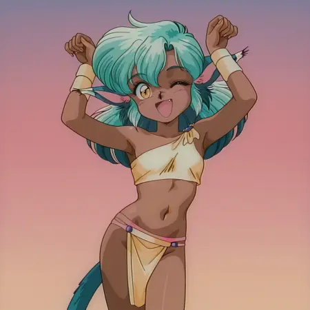 彼女の普段の衣装用のトリガー語と推奨プロンプト:ELGATORAMIEIL, retro_artstyle, 1990s_(style), animal ears, cat tail, dark-skinned female, yellow eyes, one shoulder tube top, loincloth, pink panties,