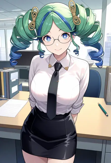 衣装なし:yu1p5x、ツインテール、ドリル髪、多色髪、緑髪、青い先端、青い目、星形の瞳、ヘアアクセサリー、ジュエリー
