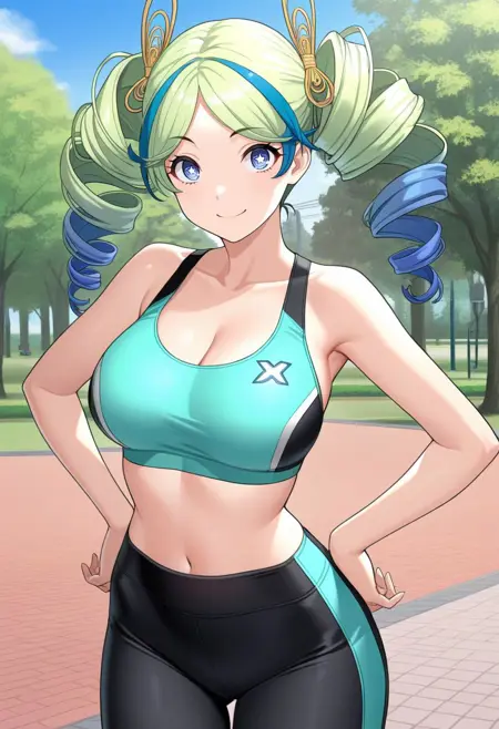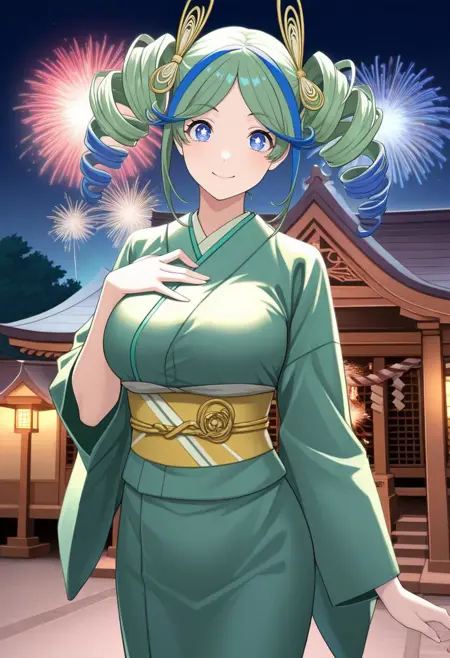 衣装あり:yu1p5x、ツインテール、ドリル髪、多色髪、緑髪、青い先端、青い目、星形の瞳、ヘアアクセサリー、ジュエリー、外れ襟、緑のドレス、リボン、腕バンド、ふわふわスカート、多色スカート、ブルマ、