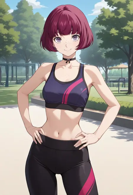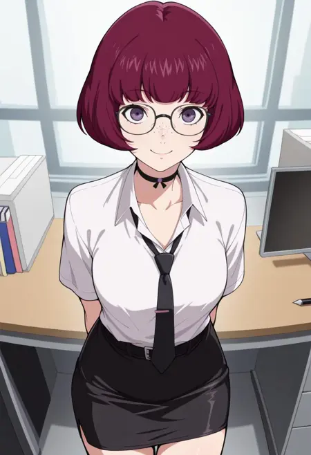 穿着服装:h1ran0p5x、洋红色头发、波波头、紫色眼睛、雀斑、项圈、紫色夹克、灰色上衣、灰色裙子、黑色膝袜,