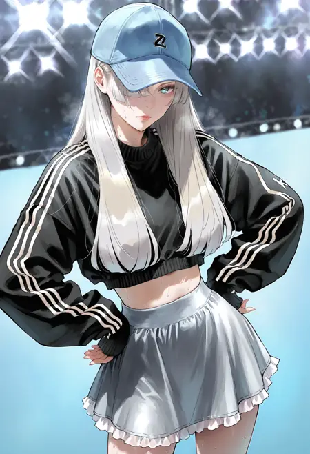 hat,skirt,jacket,baseball cap,long sleeves,midriff,frills,blue headwear,black jacket,white skirt,crop top,sleeves past wrists,frilled skirt,miniskirt,shirt,grey skirt,open jacket,open clothes