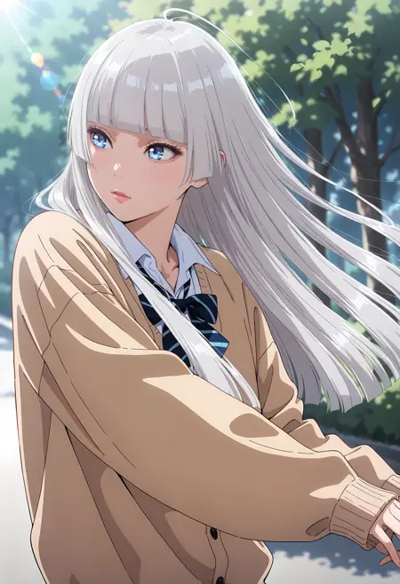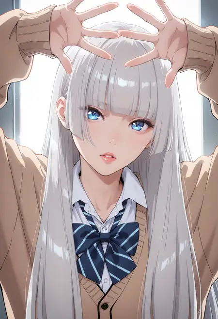 1girl,eyelashes,blue eyes,grey eyes,lips,long hair,grey hair,white hair,bangs,blunt bangs,straight hair,sidelocks,very long hair