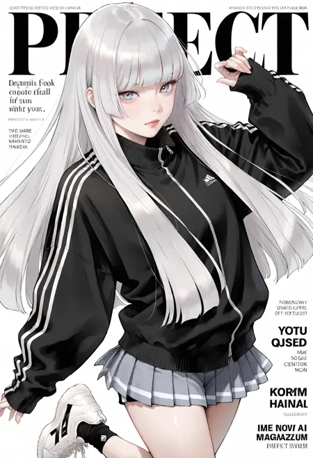 shoes,white footwear,jacket,sleeves past wrists,sneakers,long sleeves,shorts,black jacket,track jacket,socks,skirt,striped,pleated skirt