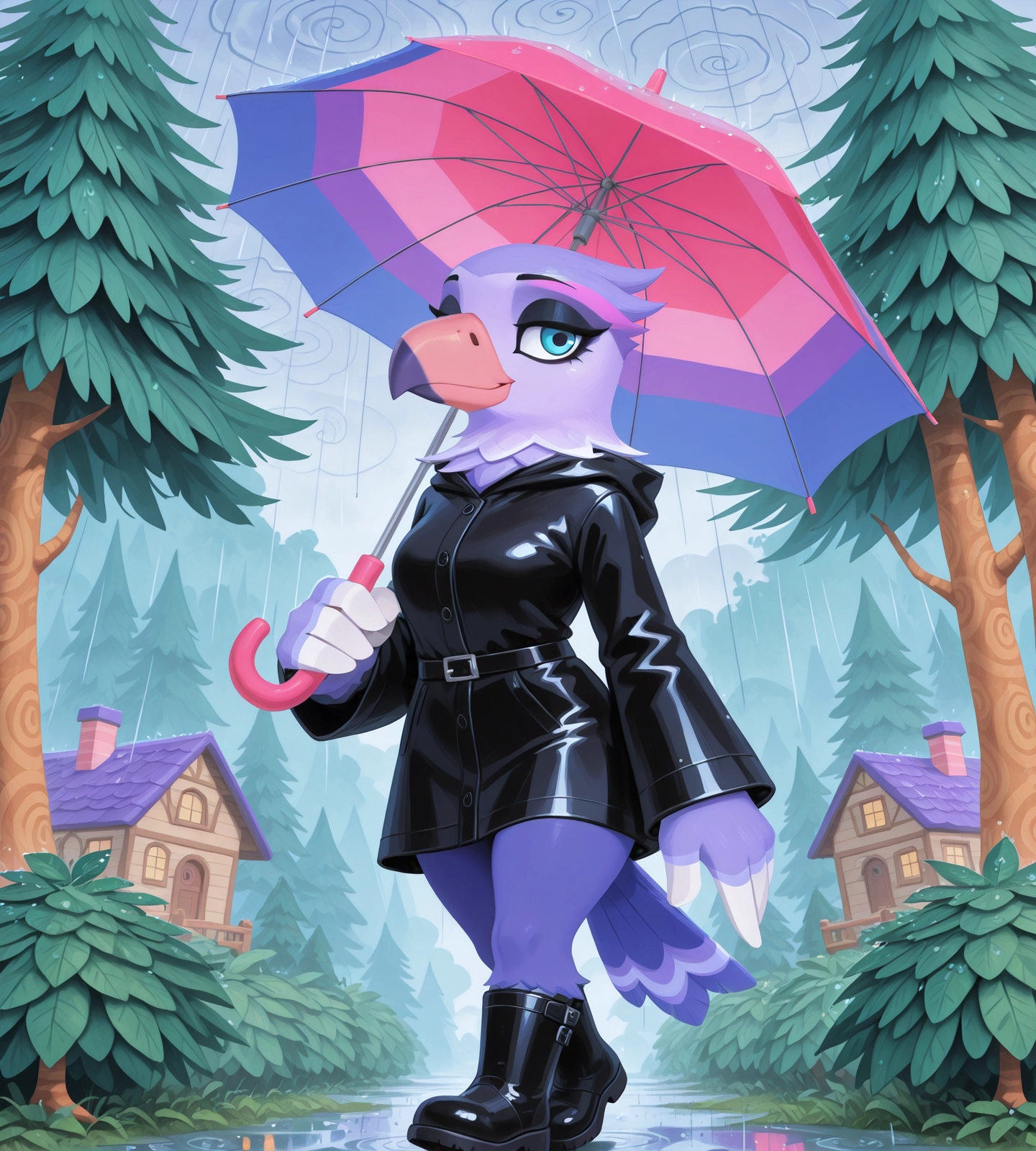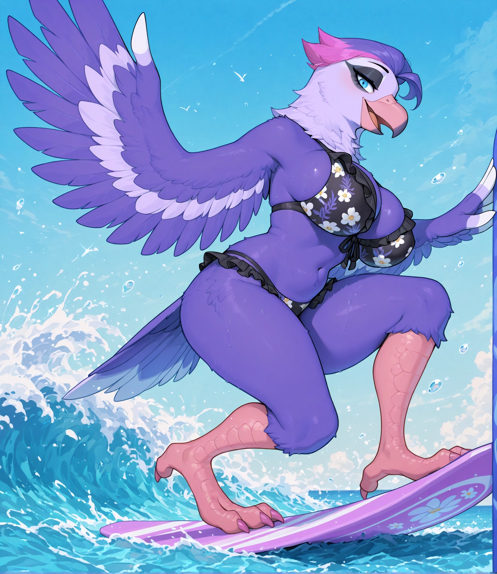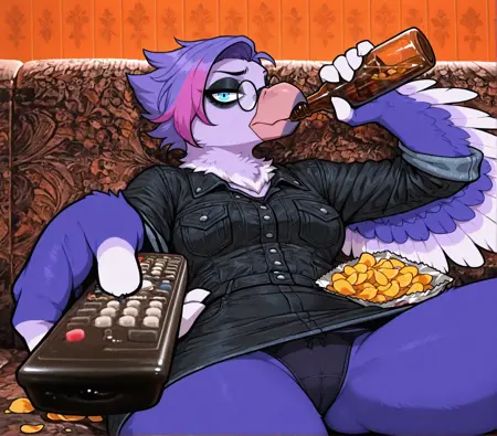 Quinn, 1girl, avian, anthro eagle, furry female, purple feathers, goth, black eyeshadow, eyeshadow, blue eyes, pink beak, black-tipped beak, purple thighs, pink talons, talon feet, bird feet, feathered arms, wing arms, feathered hands, (short quiff, short hair:1.2), (shaved head:0.8), undercut, purple hair, pink highlights, two-tone hair, lavender head, black denim jacket, long sleeves,