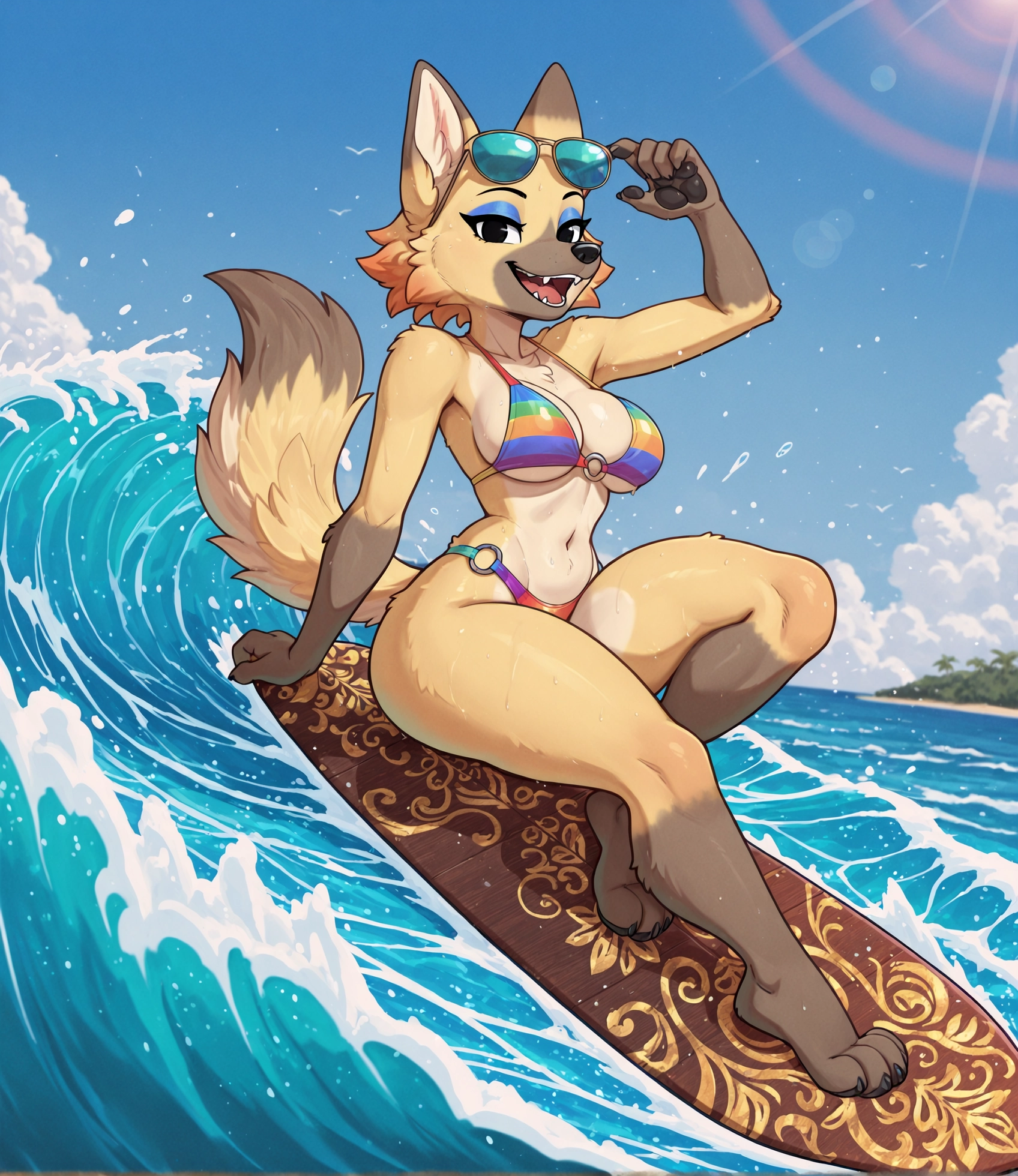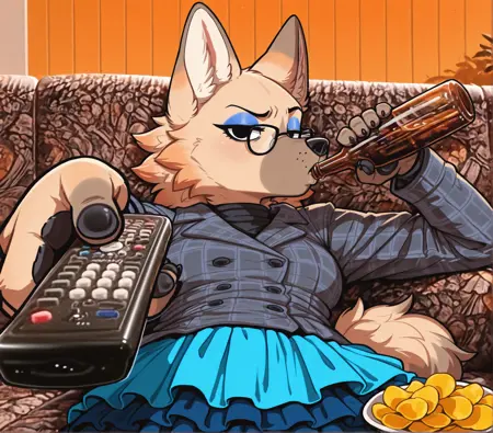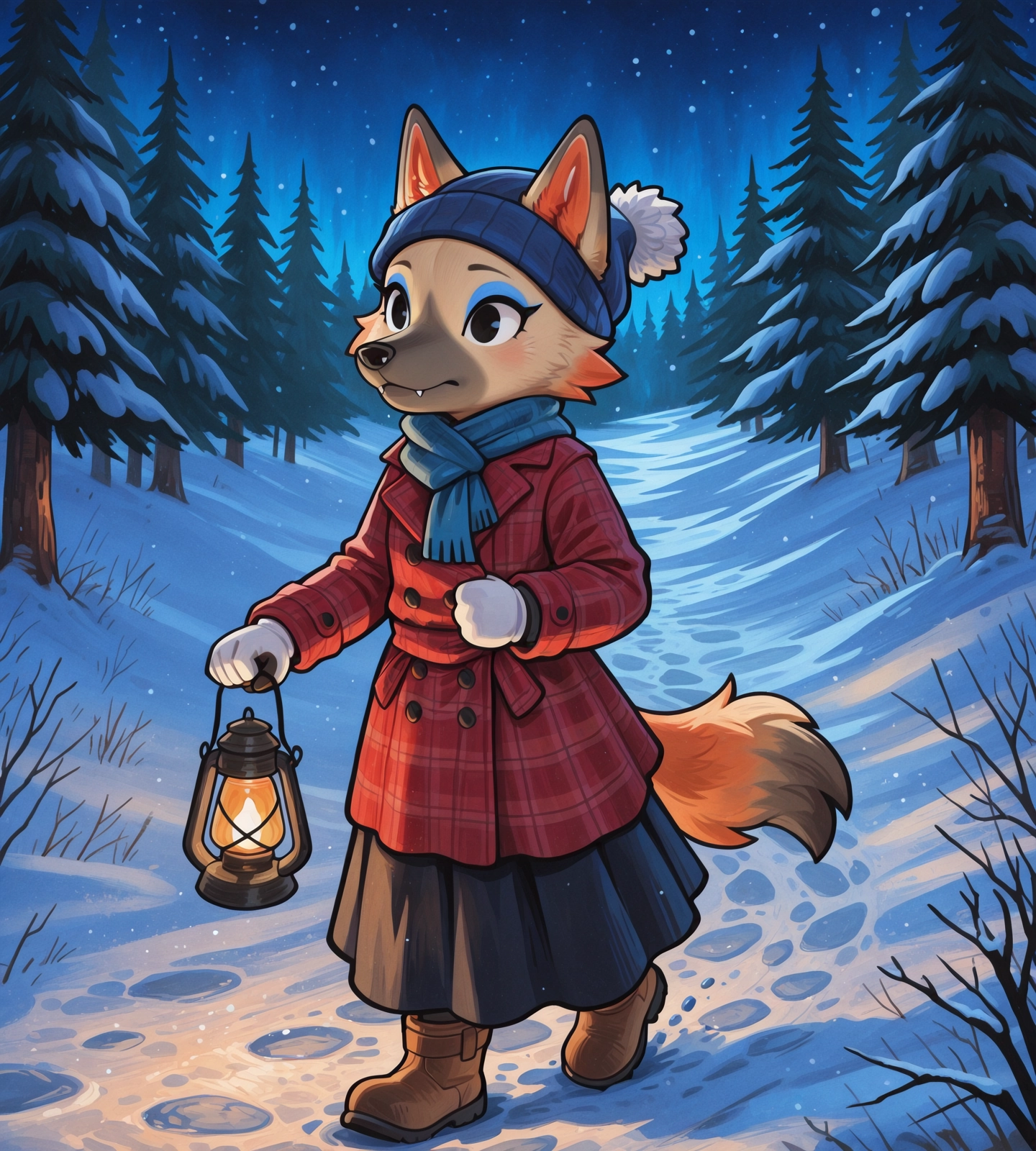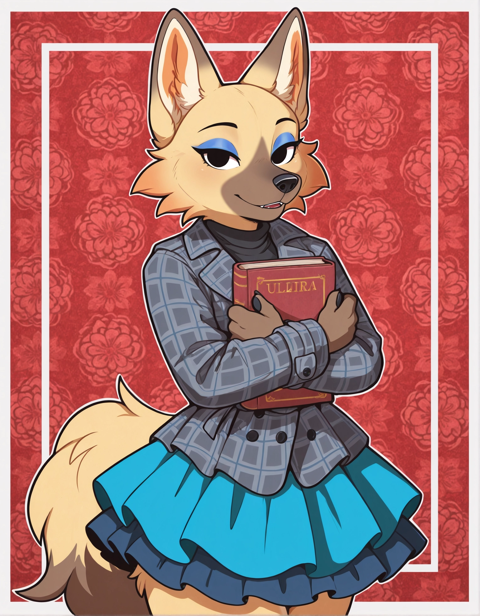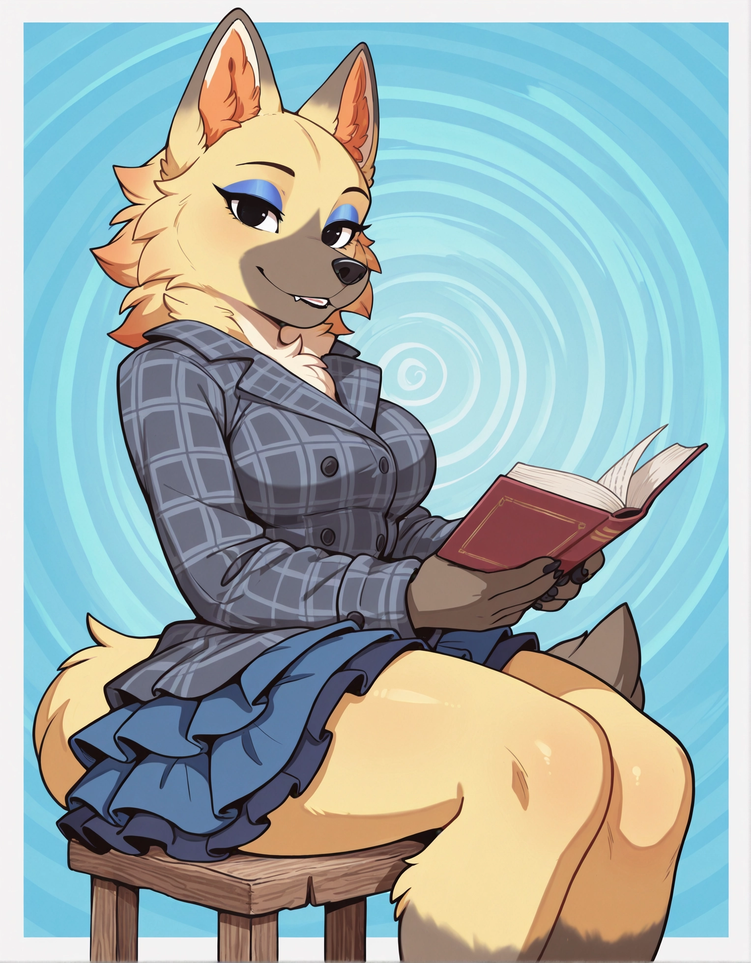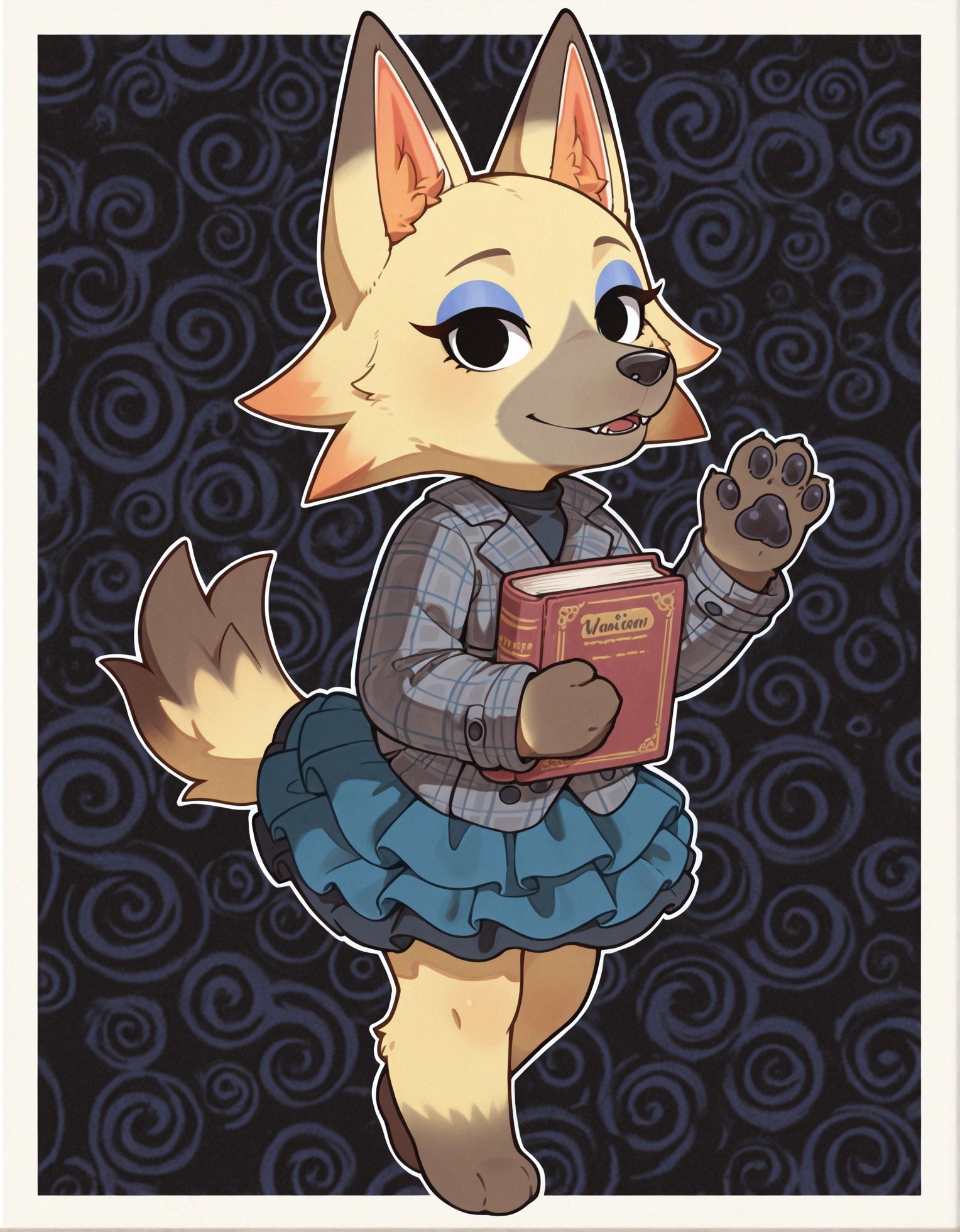 Vivian, 1girl, wolf, Animal crossing, chibi, anthro, furry female, tan fur, yellow fur, gray snout, black pawpads, fluffy cheeks, animal nose, wolf tail, fangs, wolf ears, black nose, blue eyeshadow, black eyes, plaid coat, gray coat, blue skirt, frilly skirt, short skirt, layered skirt,