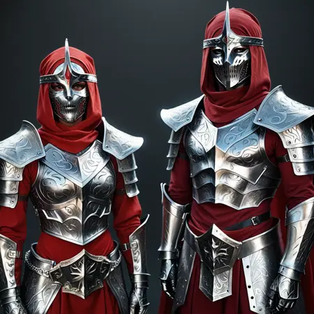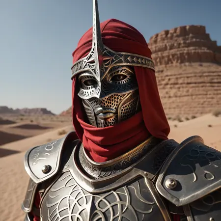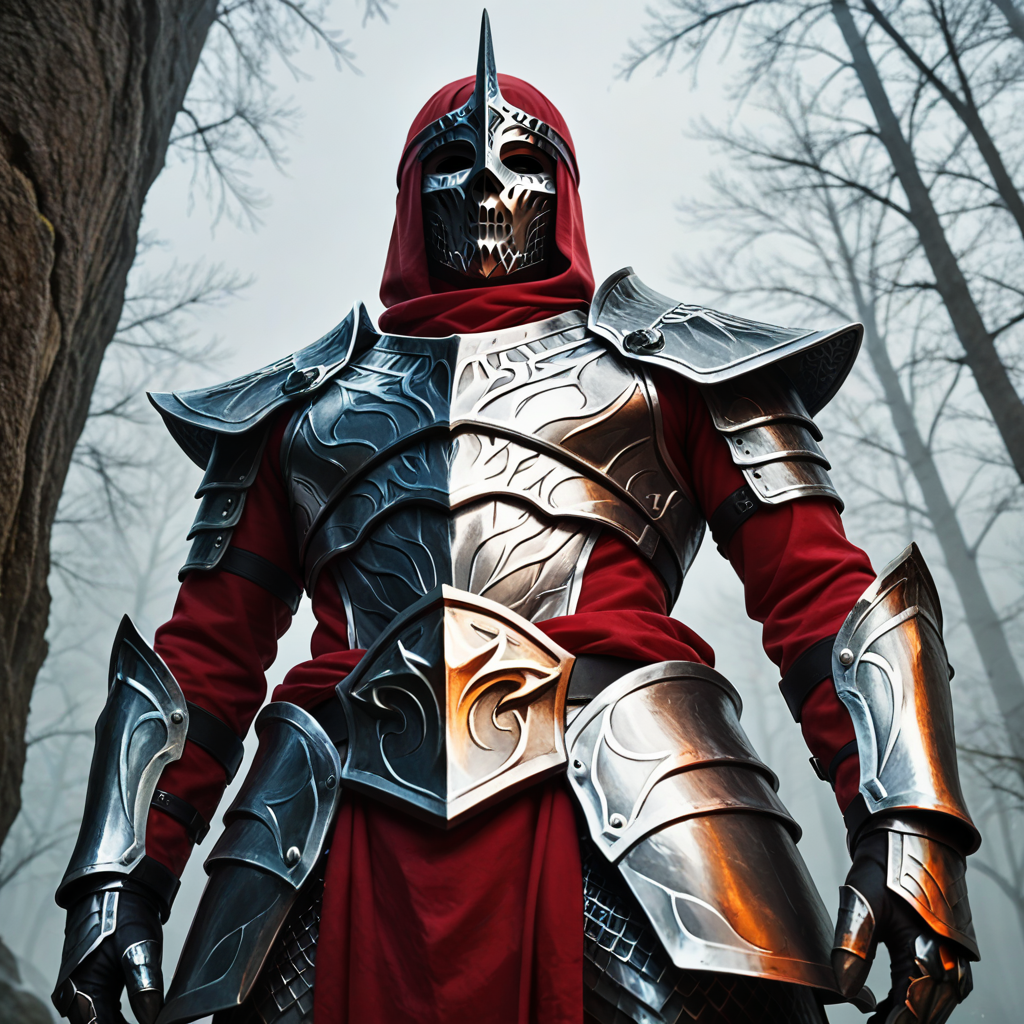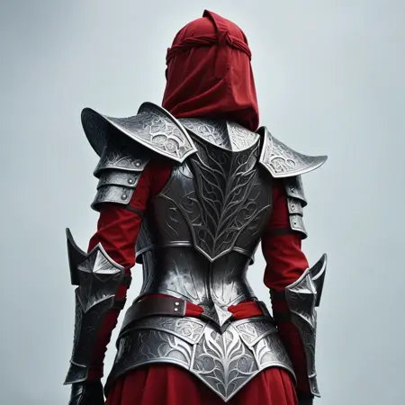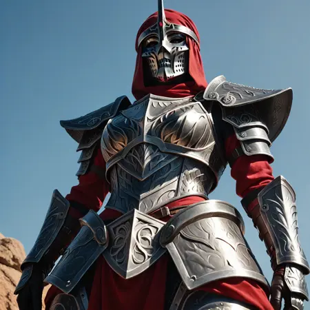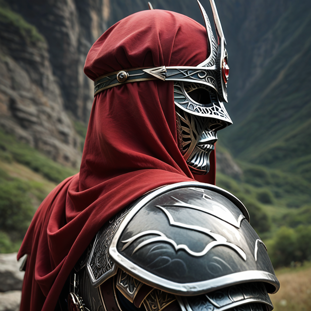 主要なトリガーワードは「MythicDawnArmor」です。補助的なトリガーワードは「黒灰色のフルアーマーで、マスクと赤い布の裏地付き」です。