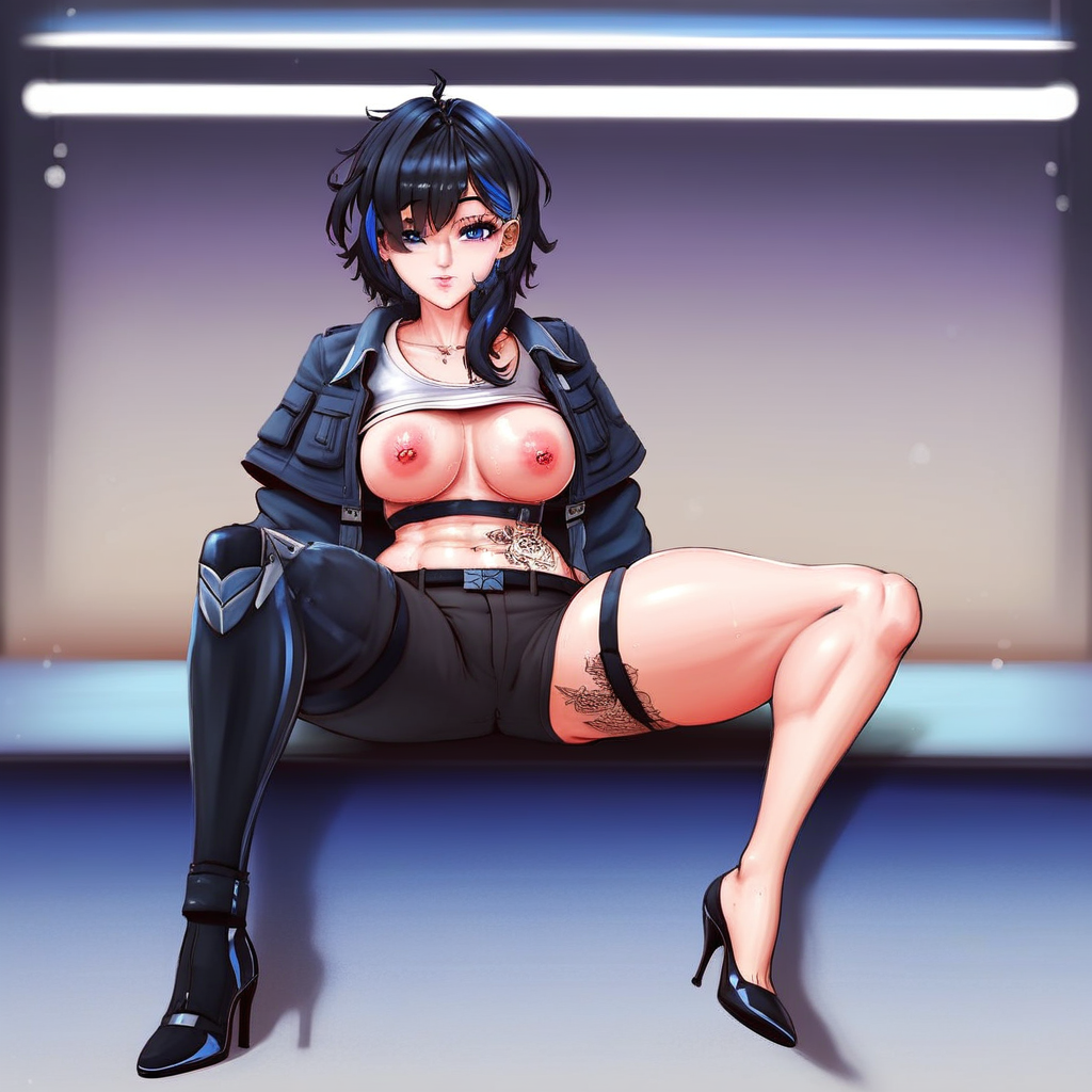 (VTuber_Ayase, 단발, 다채로운 머리카락, 파란 머리카락, 검은 머리카락, 파란 눈, 문신, 재킷, 크롭탑, 손가락 없는 장갑, 바지, 허벅지 스트랩, 한쪽 허벅지 양말, 하이힐),