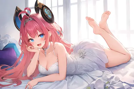 웨딩드레스 리셴나의 경우, 트리거 어휘는 다음과 같습니다: lsn\ (shadowverse), lsn_wedding, 1girl, 솔로, :d, 앞머리, 양팔 겉에 드러난 어깨, 파란 눈, 드레스, 머리끈, 머리 장식, 긴 머리카락, 관객을 바라보는 모습, 입을 벌린 모습, 미소, 웨딩드레스, 흰 드레스
