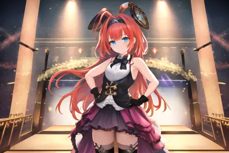 아이돌 리셴나의 경우, 트리거 어휘는 다음과 같습니다: lsn\ (shadowverse), lsn_normal, 1girl, 긴 머리카락, 솔로, 관객을 바라보는 모습, 파란 눈, 머리끈, 패드스커트, 아호게, 앞머리, 검정 패드스커트, 미소, 매우 긴 머리카락, 양팔 겉에 드러난 어깨, 검정 장갑, 검정 머리끈, 장갑, 마이크, 스커트, 소매 없는, 볼터치, 들고 있는 모습, 입을 벌린 모습, 셔츠, 전체 몸, 소매 없는 셔츠, 흰 셔츠, 리본, 오렌지색 머리카락, 빨간 머리카락, 신발, 동물 귀, 레이스, 머리 뒤로 빠지는 머리카락, 마이크를 든 모습, 분홍 머리카락