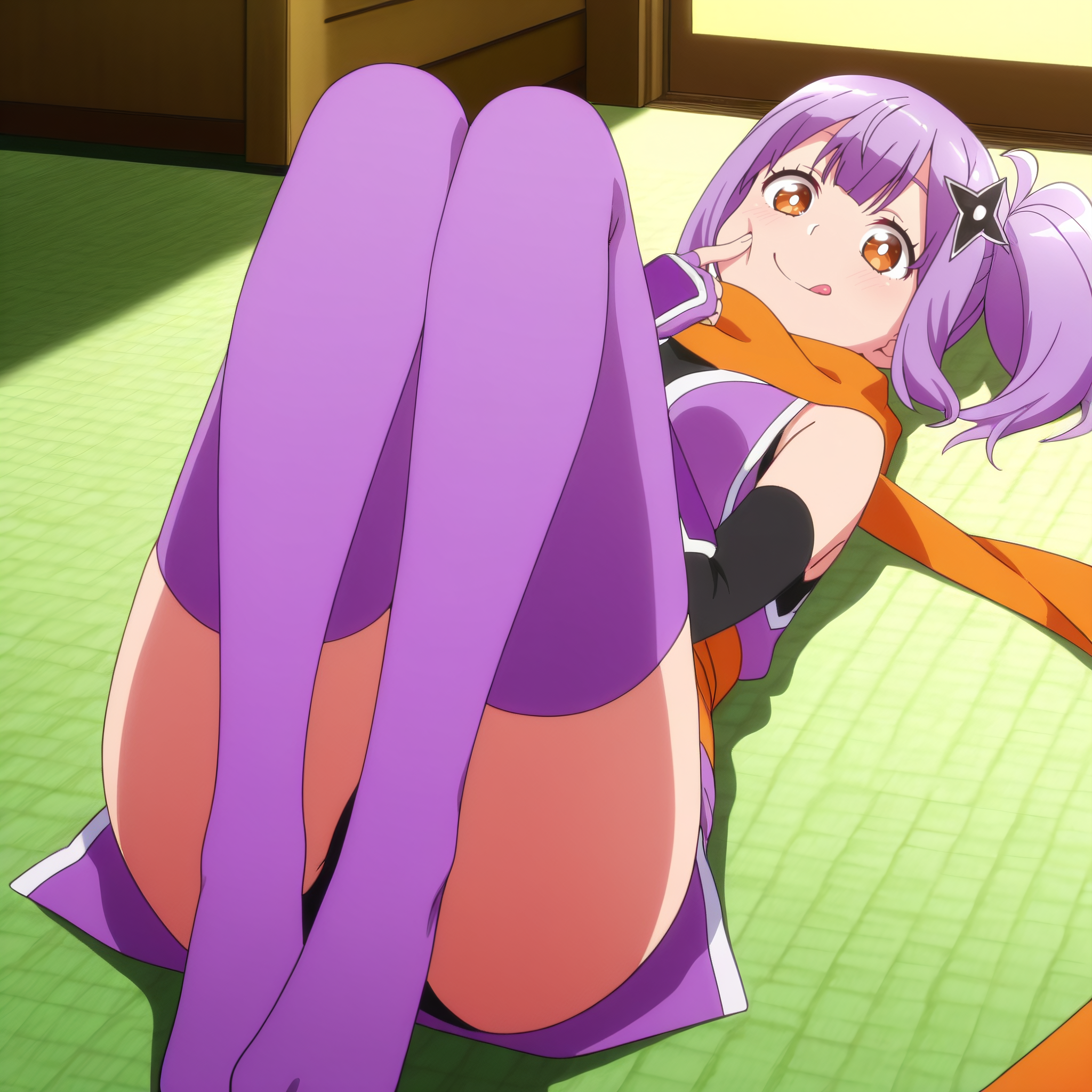 SatokoNinja、スカーフ、ニンジャ、手袋、オレンジ色のスカーフ、ノースリーブ、肘 Gloves、肩を露出、和服、指なし手袋、帯、太ももハイ、手裏剣、紫の脚部装着、シャツ、髪留め、