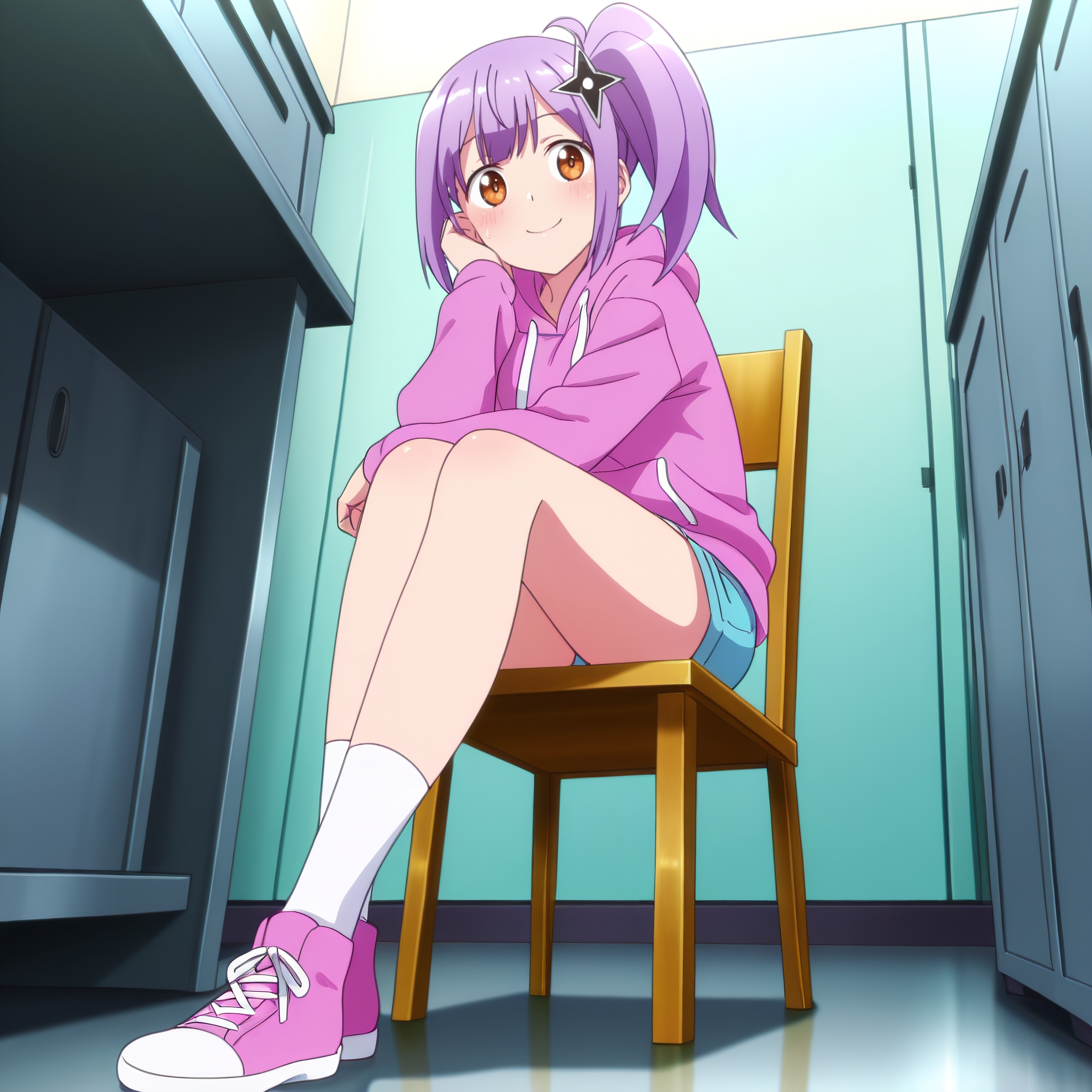 SatokoHoodie、フード、フーディー、フードを下ろした状態、青いフーディー、長袖、ショートパンツ、青いショートパンツ、短いショートパンツ、
