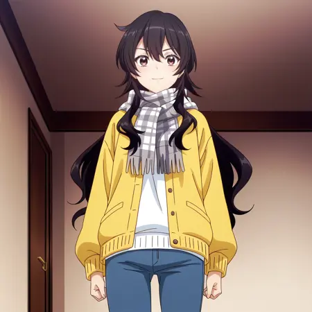 TakaoJacket, long sleeves, scarf, pants, denim, checkered scarf, sweater, grey scarf, blue pants, jeans, jacket, plaid scarf, yellow jacket,