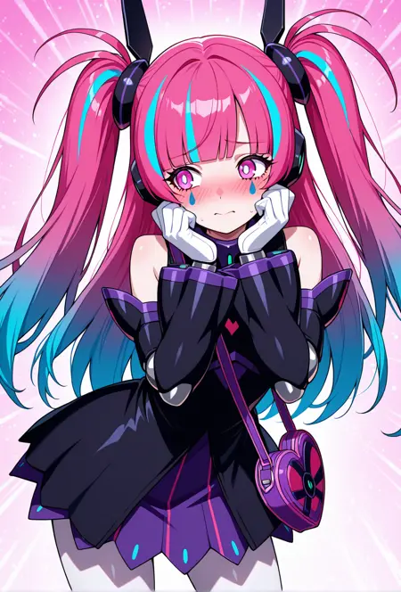 droitclair, 1girl, 다색 머리카락, 트윈테일, 파란 머리카락, 볼빨간, 안드로이드, 분홍 머리카락, 로봇 관절, 파란 그라데이션 긴 다색 분홍 줄무늬 머리카락, 눈물방울 모양 안면 무늬, 긴 머리카락, 분홍 눈, 로봇 귀, 그라데이션 머리카락, 이색 머리카락, 둔한 앞머리, 헤드기어, two_side_up, 흰 장갑, 흰 동공, 창백한 피부,