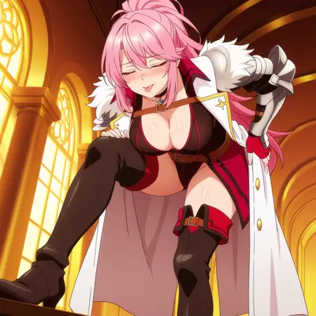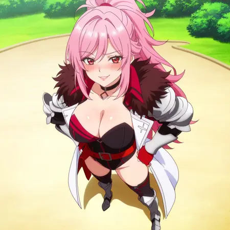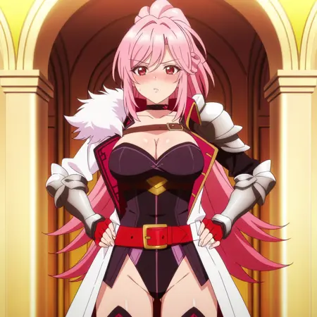 cleavage, gloves, red gloves, armor, choker, fingerless gloves, thighhighs, leotard, belt, coat, fur trim, gauntlets,