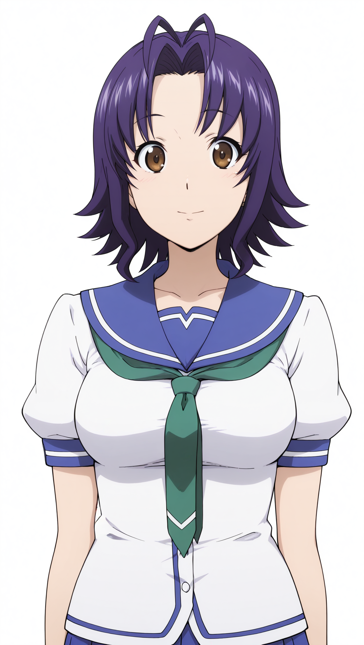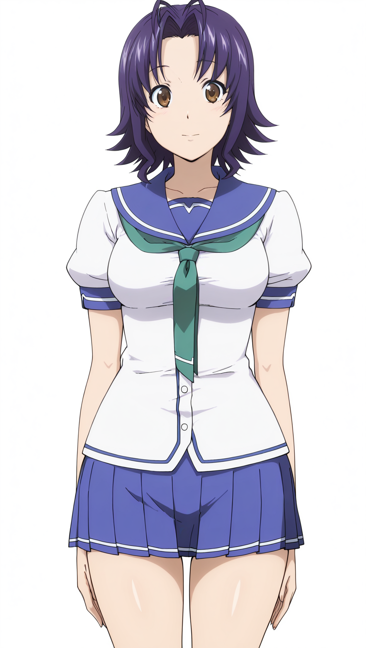 anime coloring, masterpiece, best quality, amazing quality, yuukaamato, 1girl, short hair, purple hair, brown eyes, medium breasts, neckerchief, green neckerchief, shirt, short sleeves, skirt, blue skirt, solo, pose, standing, looking at viewer, from front, ((((white background, simple background))))