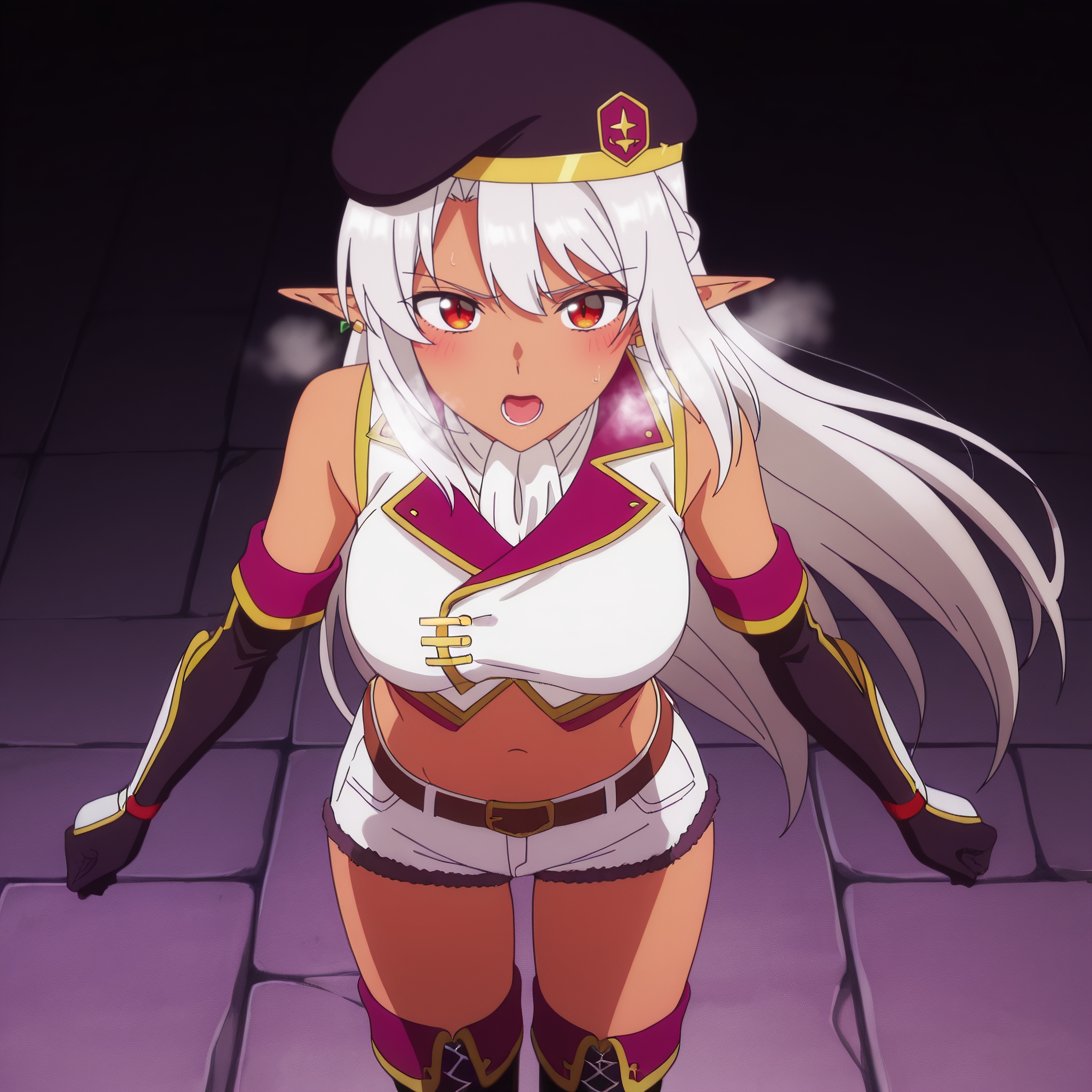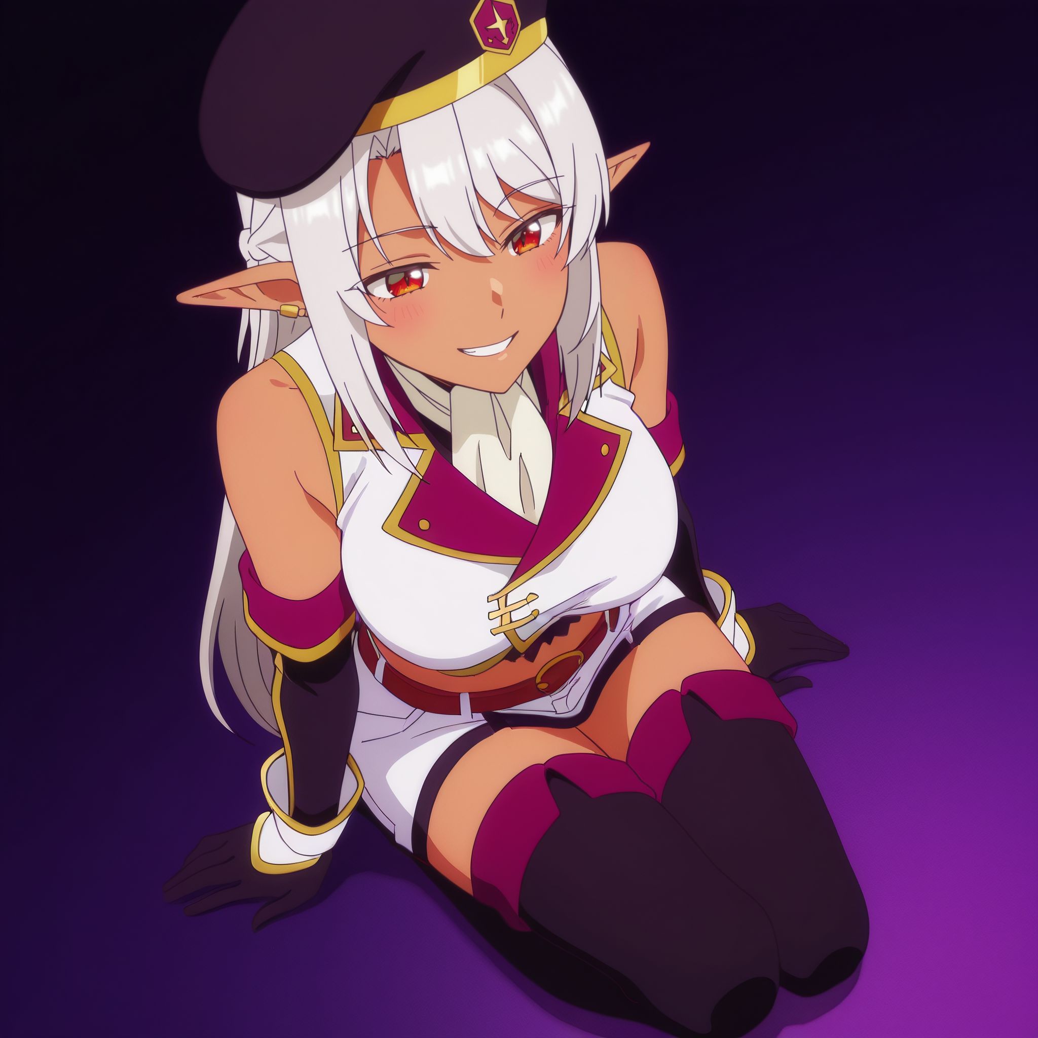 SilkCombat,帽子,珠宝,露肩,耳环,无袖,贝雷帽,手套,黑色头饰,过膝袜,肘部手套,上衣,无袖上衣,露腹,腰带,裙子,
