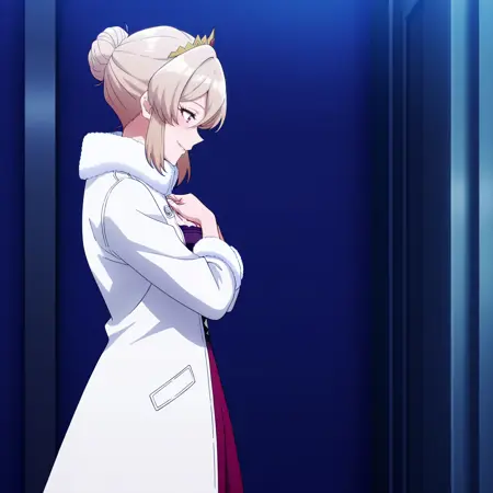A4OAmaranthus, blonde hair, short hair, bangs, purple eyes, hair between eyes, hair bun, sidelocks,