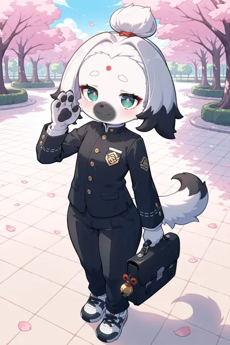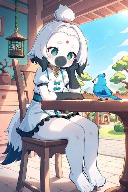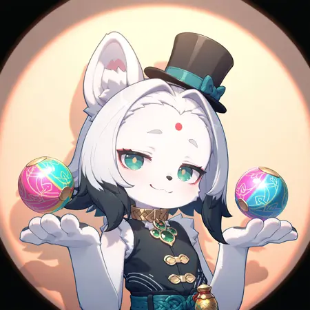 触发词: zzzkean, 兽娘, 双色发, 发髻, 发圈, 额头标记, 浓眉, black_around_mouth, 狗尾,