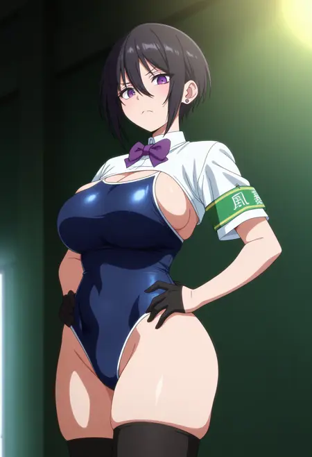 _스킨 인덴테이션, 너무 작은 옷, 색감 아우터 \(의상\), 크롭된 셔츠, 흰색 셔츠, 보라색 리본넥타이, 단팔, 옷 안에 수영복, 파란색 원피스 수영복, 경쟁용 학교 수영복, 팔밴드, 검은 장갑, 반장갑, 검은 허벅지까지 양말, 우바키, 흰색 신발, 파란색 신발, 이톤 신발,