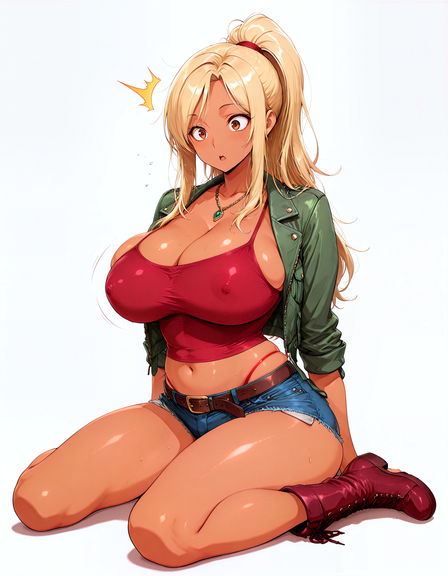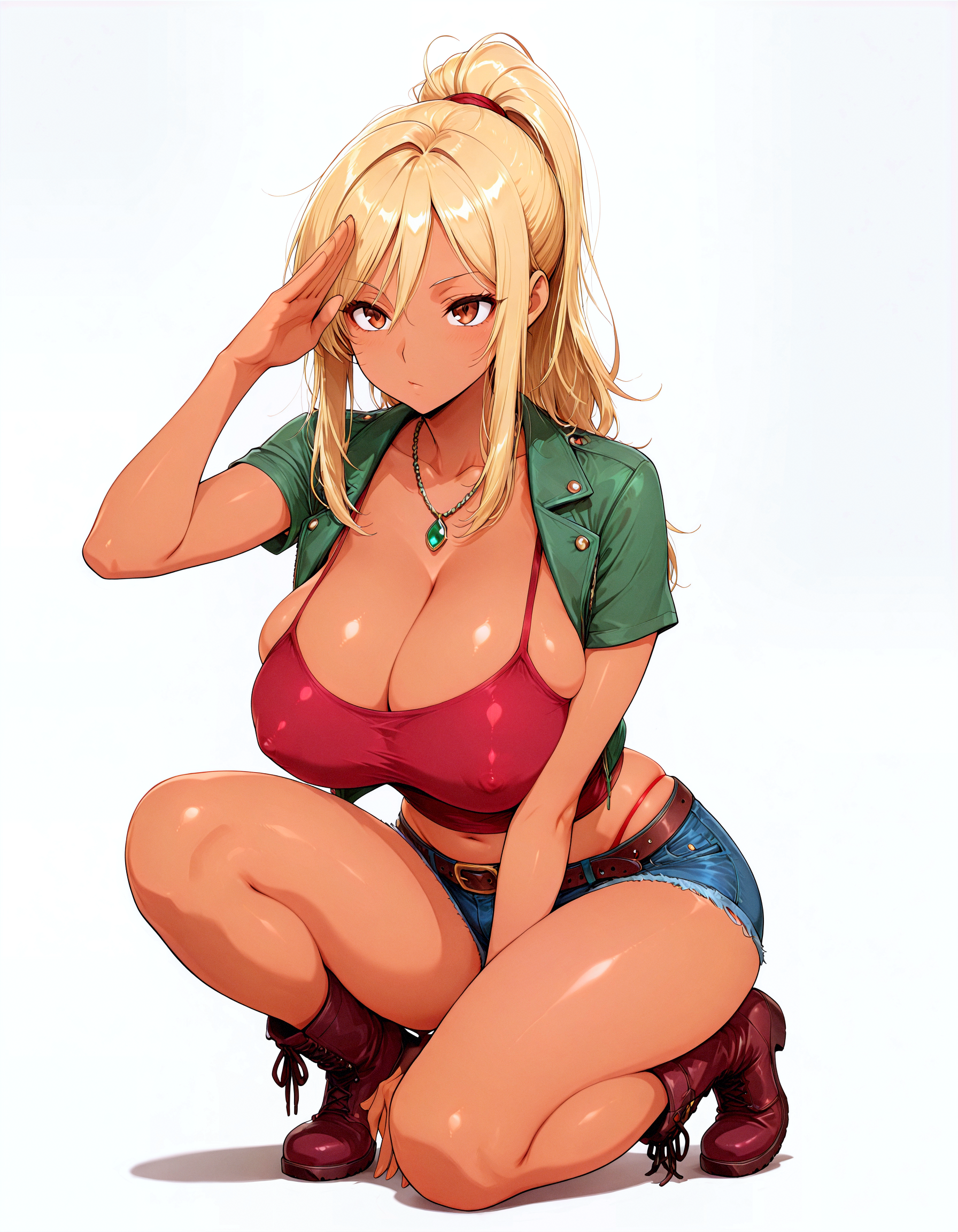 2j, 1girl, dark skin, heroic face, breasts, solo, blonde hair, brown eyes, cleavage, long hair, big breasts, necklace, short shorts, belt, red high-rise thong, camisole t-shirt, ponytail, full body, boots, jewelry, covered nipples, simple background, white background, midriff, red camisole T-shirt, green jacket, mature, mature woman, hot girl, denim super shorts,
