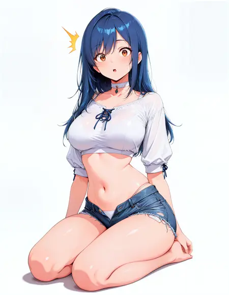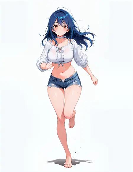3m, 1girl, solo, cute face, full body, long hair, barefoot, brown eye, blue hair, looking at viewer, white choker, short shorts, midriff, collarbone, panties, white shirt, bare legs, puffed sleeve crop top, open-fly denim shorts,