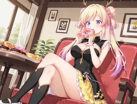 | 训练词汇 | blonde_hair, purple_eyes, long_hair, twintails, medium_breasts, double_bun, pink_hair, bangs, hair_bun, large_breasts, gradient_hair, multicolored_hair,已复制! kneehighs, black_socks, hair_ornament, hair_flower, jewelry, bracelet, black_dress, antlers, white_footwear, shoes, skirt, sleeveless, bow, wrist_cuffs, ribbon已复制! |