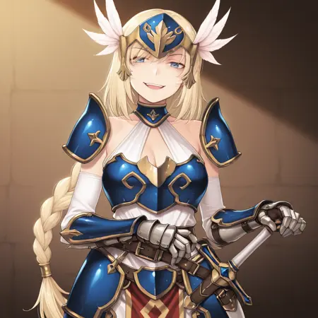 Armour: blue and gold headpiece, feather ornament headpiece, blue metal choker, white halter top, blue armor, breast plate, shoulder plates, hip armor, armored gloves, wrist guards, white detached sleeves, red pelvic curtain, white waist cape, tassel rimmed waist cape, golden ornaments, white thigh highs, armored boots,