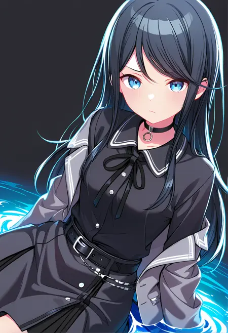 ICHIKA, 1girl, skirt, shirt, jacket, blue eyes, neck ribbon, sitting, looking at viewer, white background, black shirt, grey jacket, black ribbon, black skirt, simple background, ribbon, choker, long sleeves, water, off shoulder, closed mouth, belt, collared shirt, open clothes, indifferent