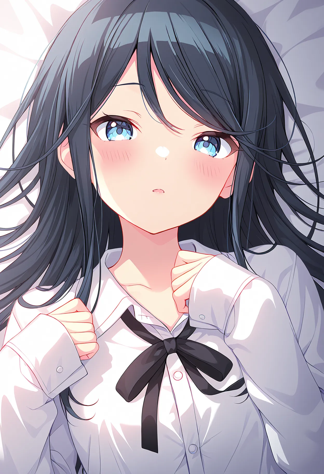 ICHIKA, 1girl, shirt, looking at viewer, lying, white shirt, long sleeves, parted lips, on back, upper body, collared shirt, sleeves past wrists, blue eyes, bed sheet, blush, dress shirt, black ribbon, ribbon