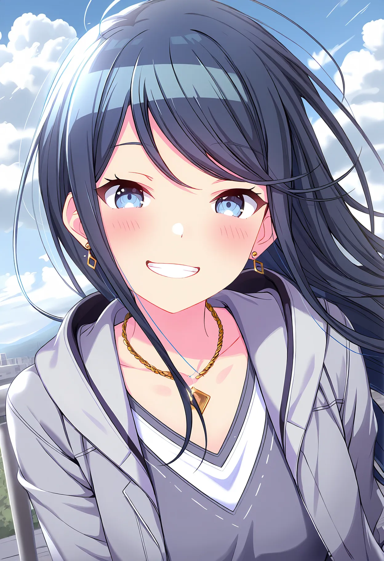 ICHIKA, 1girl, smile, jewelry, jacket, looking at viewer, necklace, blue hair, upper body, shirt, open clothes, sky, swept bangs, long sleeves, hood, cloud, outdoors, collarbone, open jacket, grin, blush, hood down, hooded jacket, grey jacket, day, cloudy sky